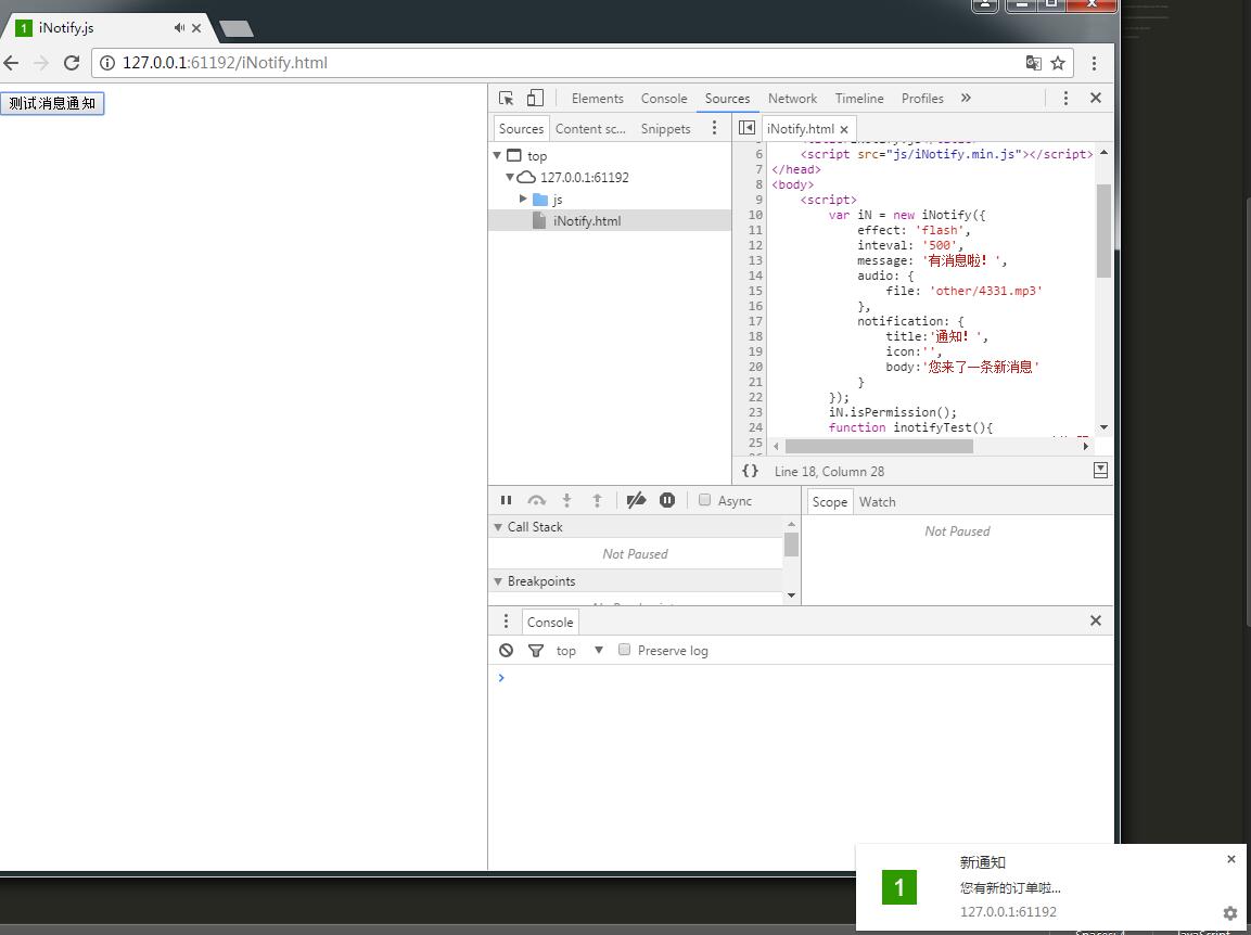 这是重复造轮子...,标题闪烁、或者滚动提示,favicon数字显示。打开chrome浏览器调试工具,按照下面截图的方式放到调试里面调用一下,你就可以看到效果了。