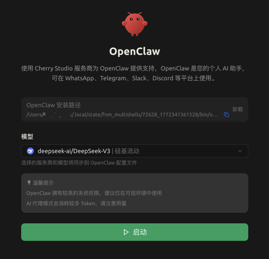 只要安装最新版 Cherry Studio v1.7.19,左侧菜单已经默认集成 OpenClaw 入口,点击小龙虾图标,按引导安装即可完成部署。