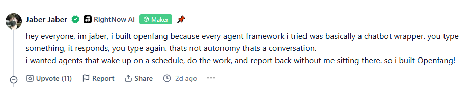 大家好,我是 Jaber,我开发了 OpenFang,因为我尝试过的所有智能体框架本质上都只是聊天机器人的封装。你输入内容,它回复,你再输入。这不是自主性,这只是对话。我想要的是能够按时“上线”,完成工作,并在无需我守候的情况下汇报结果的智能体。所以我开发了 OpenFang!